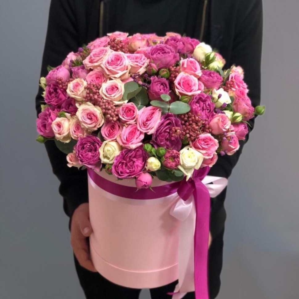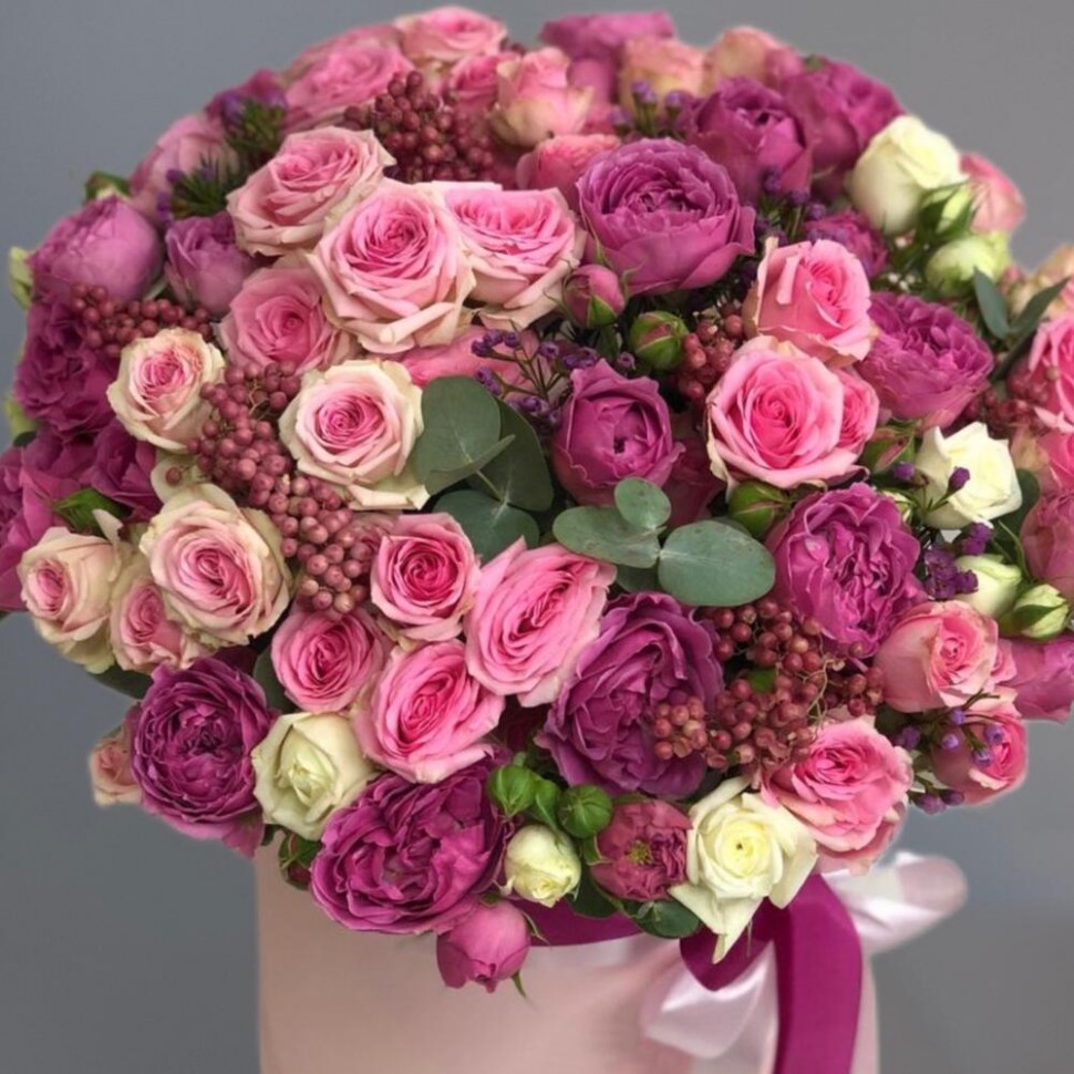 - Эта удивительная коробочка из Misty bubbles — настоящее произведение искусства! Нежные кустовые розы, окруженные изящными тюльпанами и диантусами, создают волшебную атмосферу и наполняют комнату невероятным ароматом. А веточки гиперикума и эустомы добавляют ярких красок и завершают эту прекрасную композицию.
