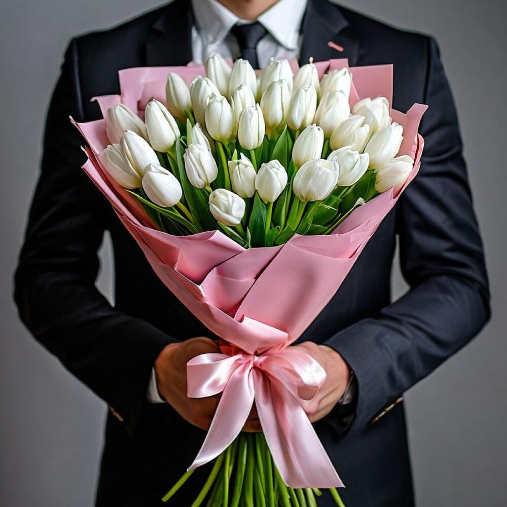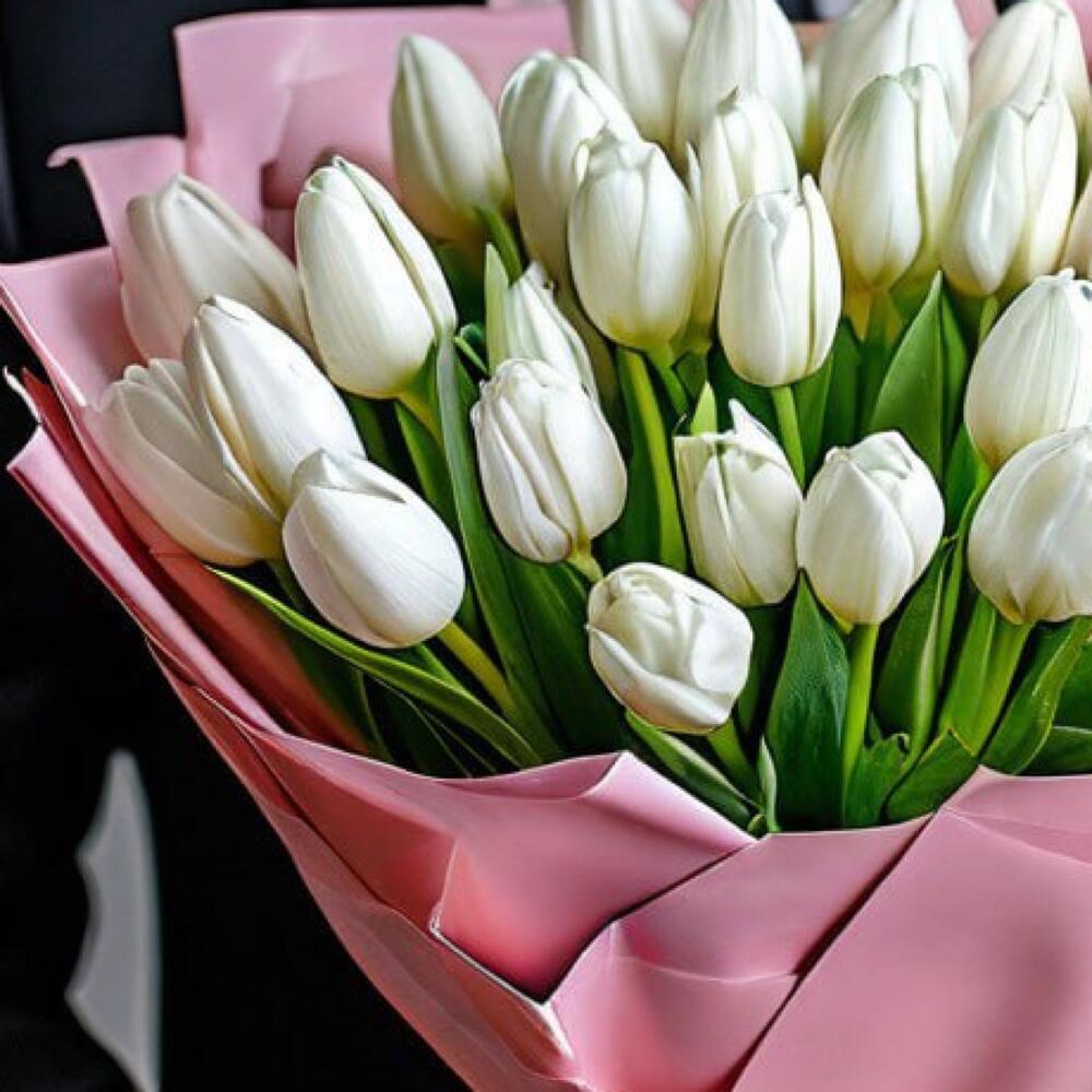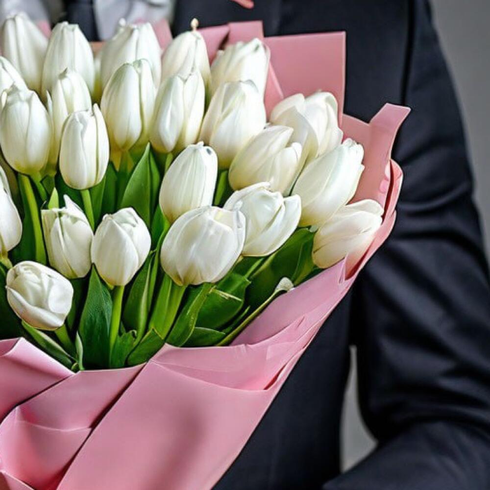 Роскошный букет из 35 белоснежных тюльпанов — воплощение чистоты, искренности и благородства.