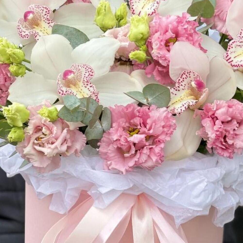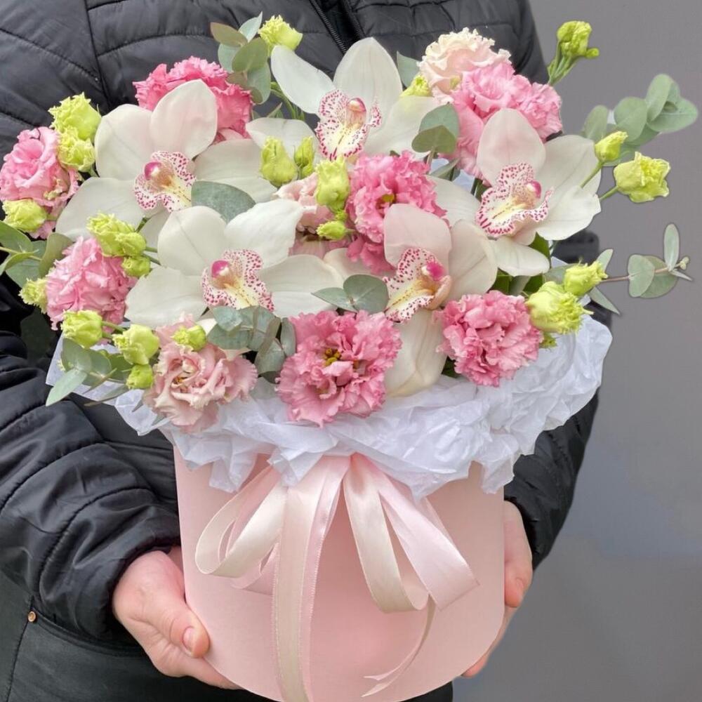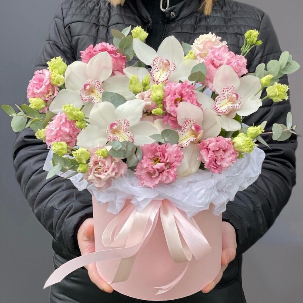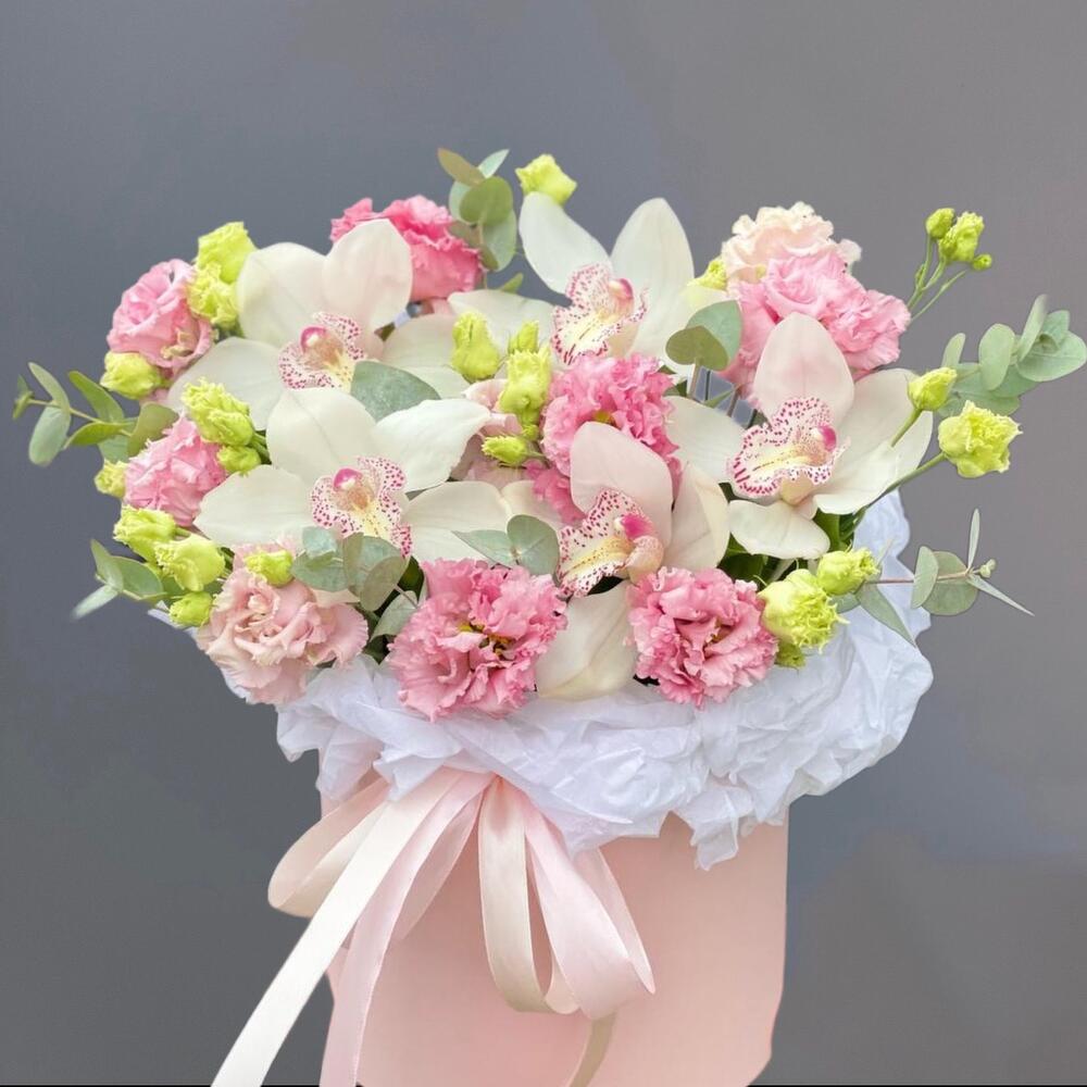 Орхидея Цимбидиум — 5 шт. Эвкалипт — 5 шт. Эустома — 7 шт. Коробка — 1 шт