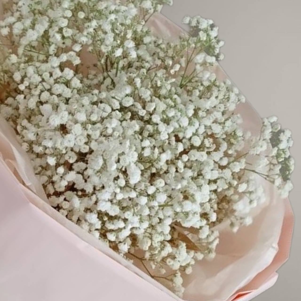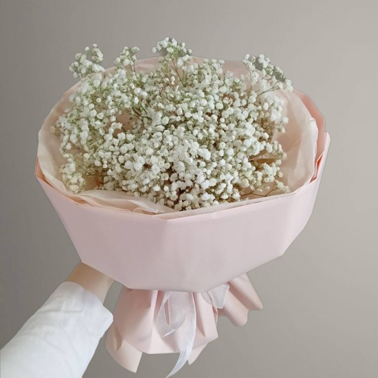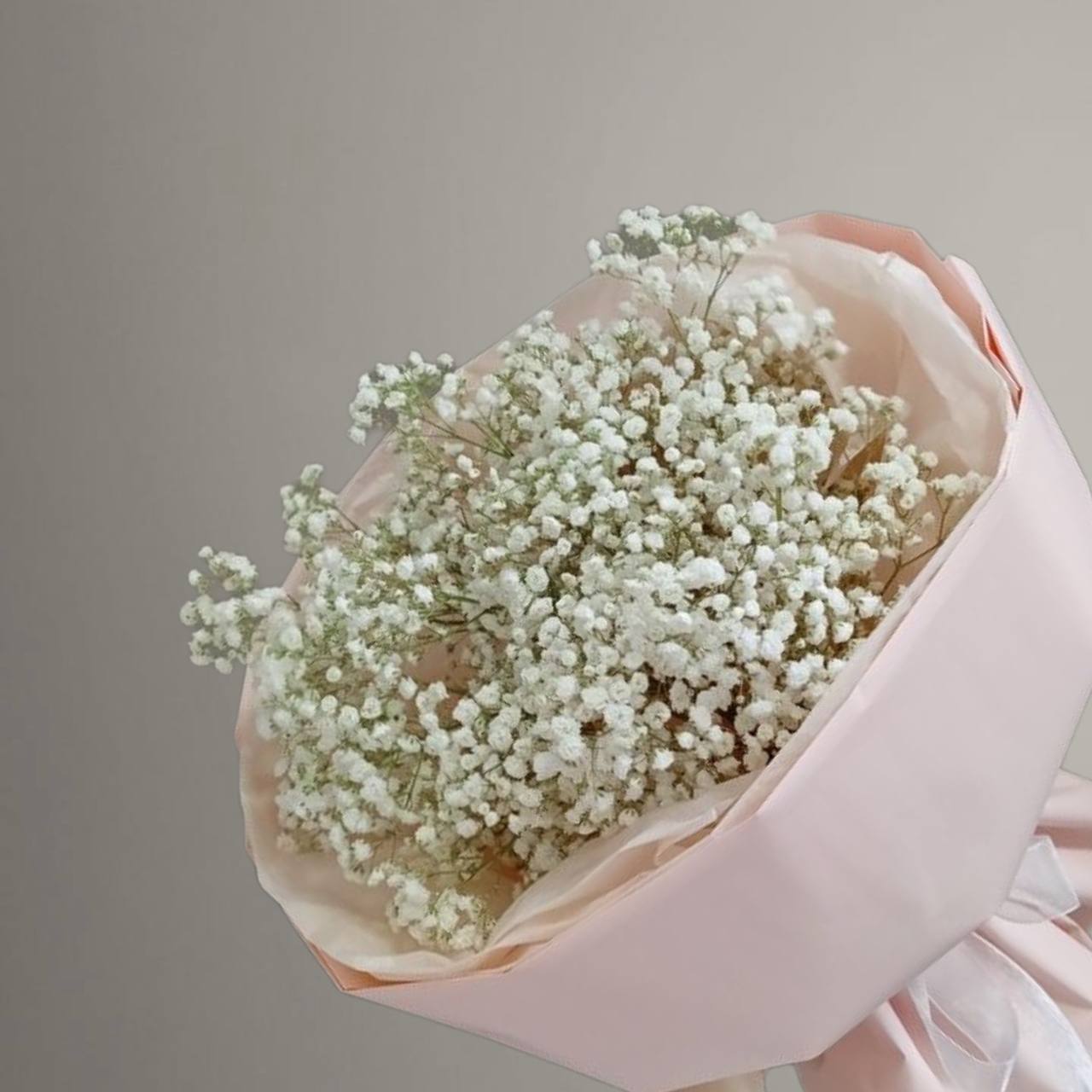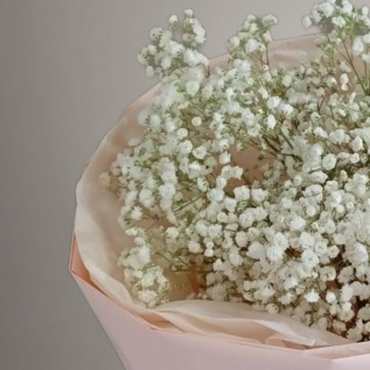 • Букет из 5 белых гипсофил в розовой упаковке – это воплощение нежности и изящества. Легкие и воздушные цветы в сочетании с нежно-розовой упаковкой создают романтичное настроение.