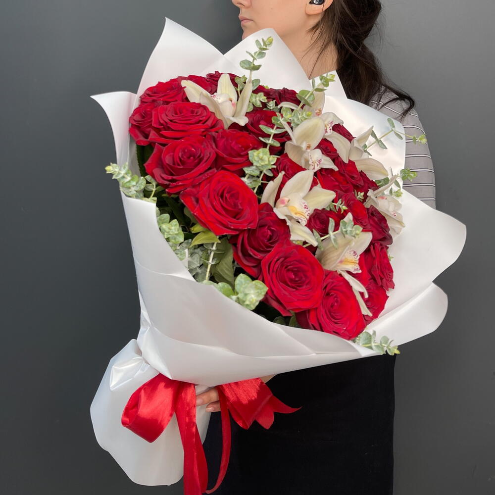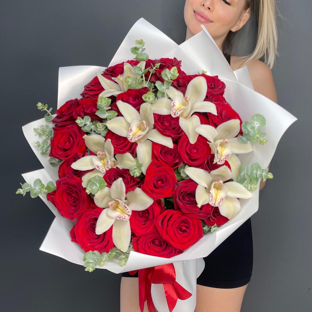 - Букет из красных роз и белых орхидей — это настоящее произведение искусства.