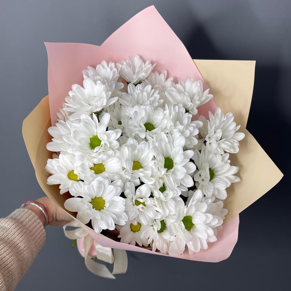 • Нежный букет из 5 хризантем ромашковых в розовой упаковке – идеальное решение для тех, кто ищет прекрасный подарок для любимой женщины.