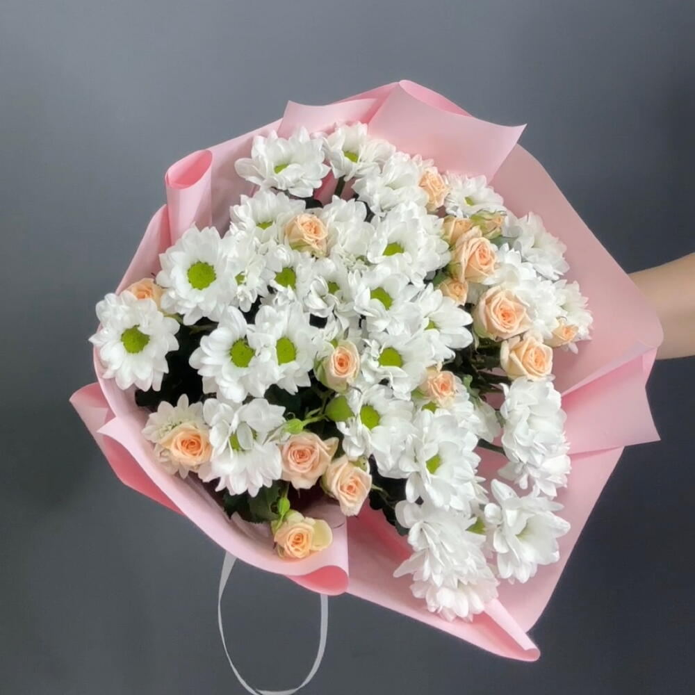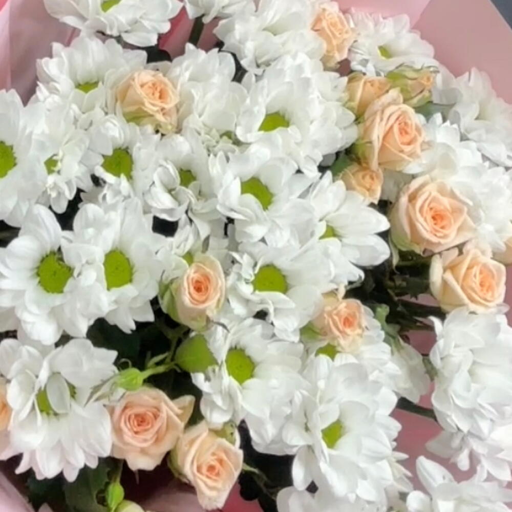 • Кустовая роза кремовая и кустовая хризантема белая – это идеальное сочетание для создания нежной и элегантной композиции.