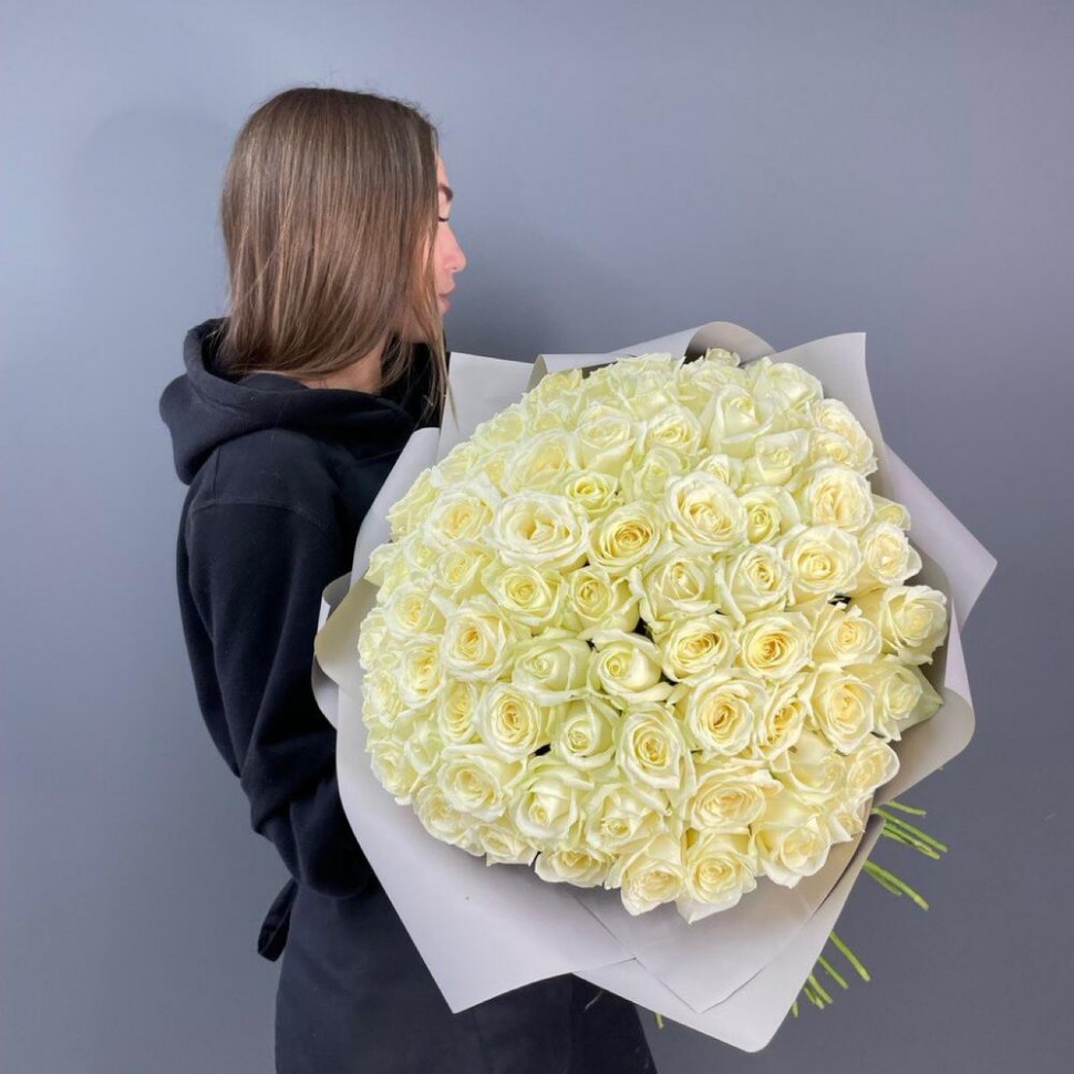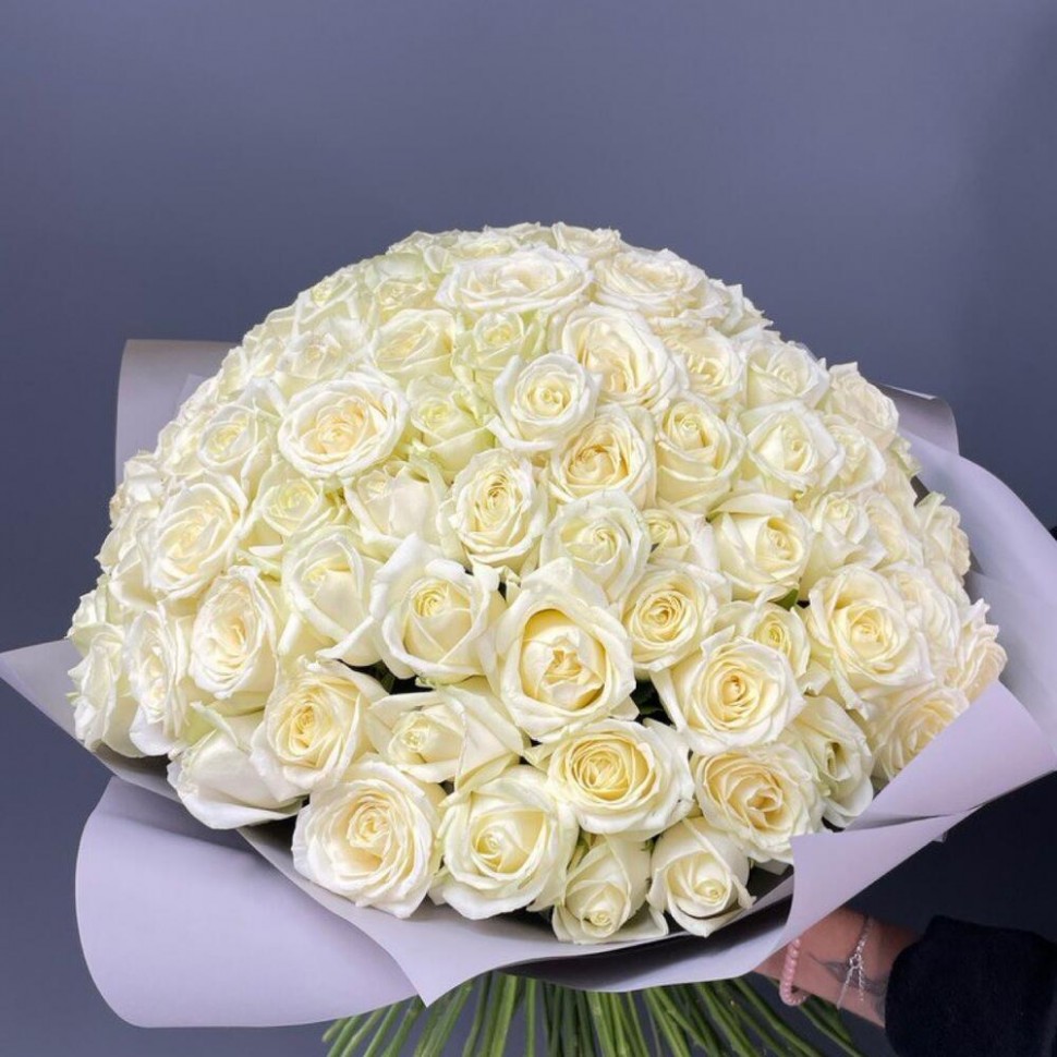 • Эта удивительная композиция из 101 белой розы в серой матовой упаковке является настоящим произведением искусства! Белые розы — символ чистоты, нежности и искренности чувств.