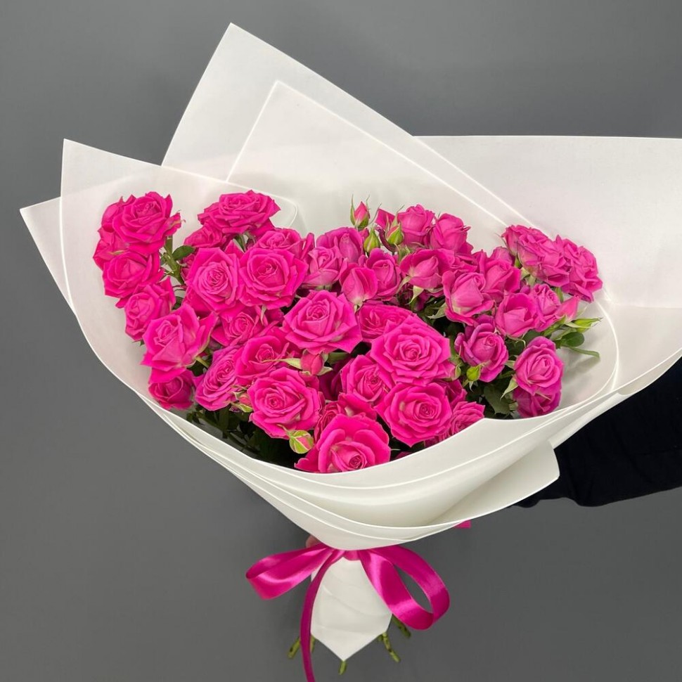 - Этот букет из 11 роскошных малиновых кустовых роз, украшенных белым фоамираном, является воплощением изысканности и элегантности.