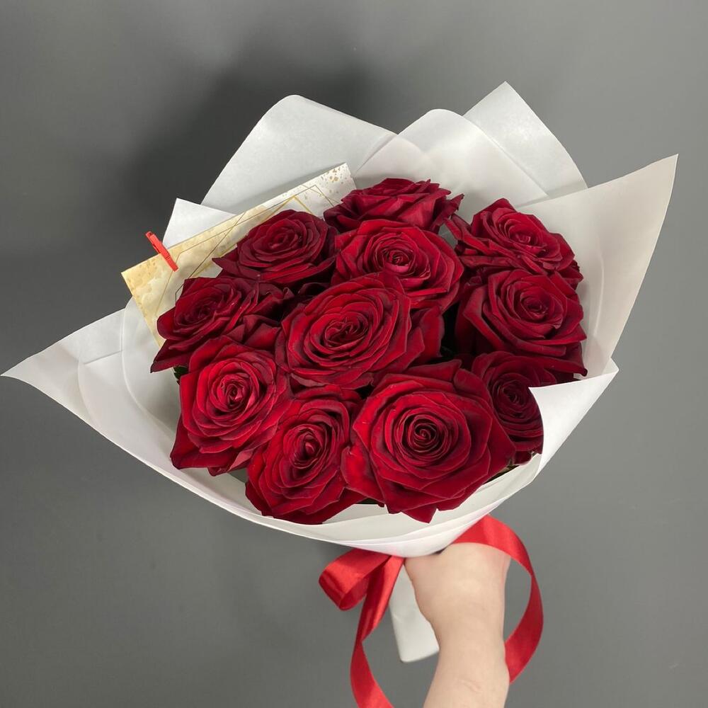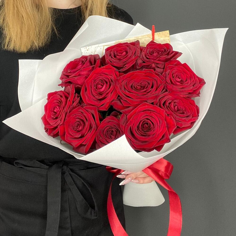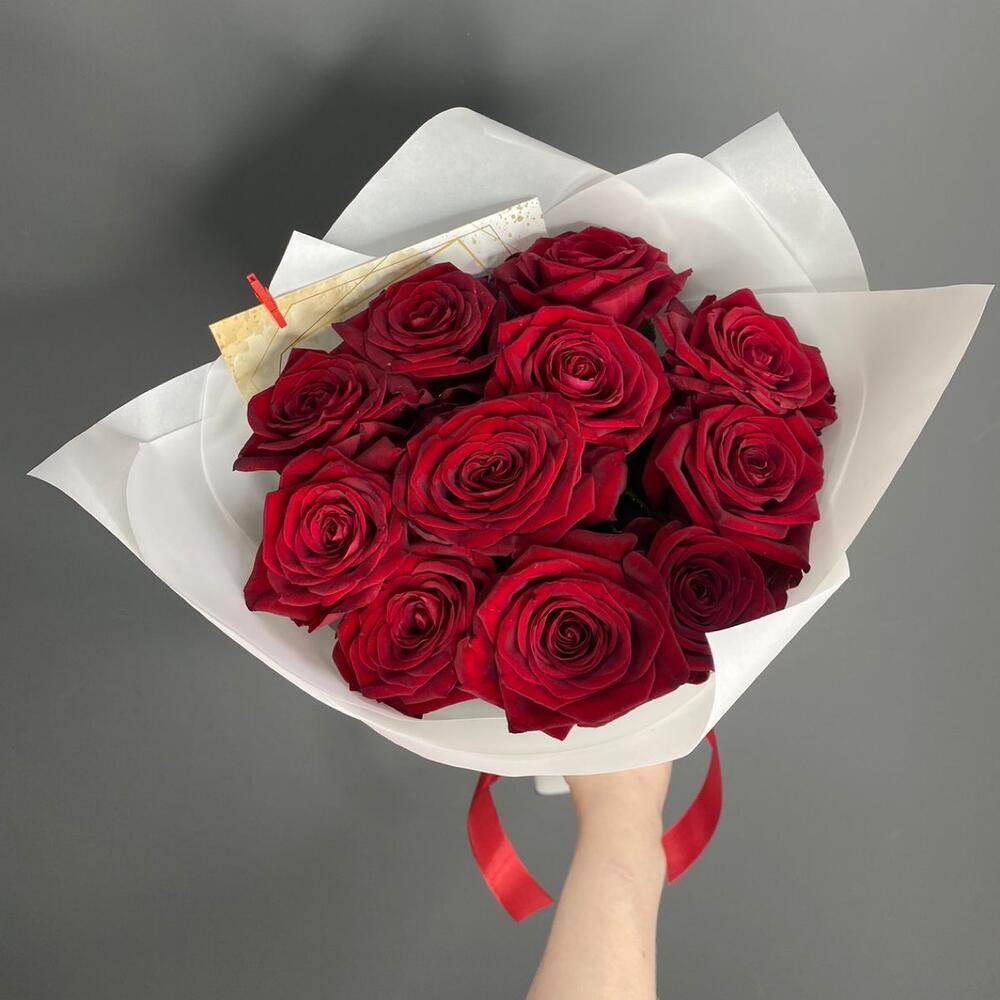 • Этот букет из 11 красных элитных роз в белой коробке — настоящий шедевр флористического искусства. Каждый цветок имеет неповторимый оттенок и форму, что создает эффект естественности и живости.