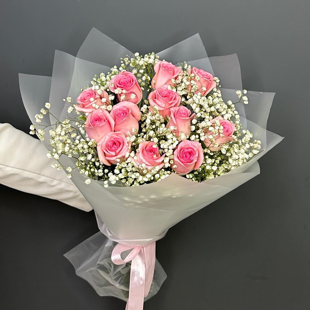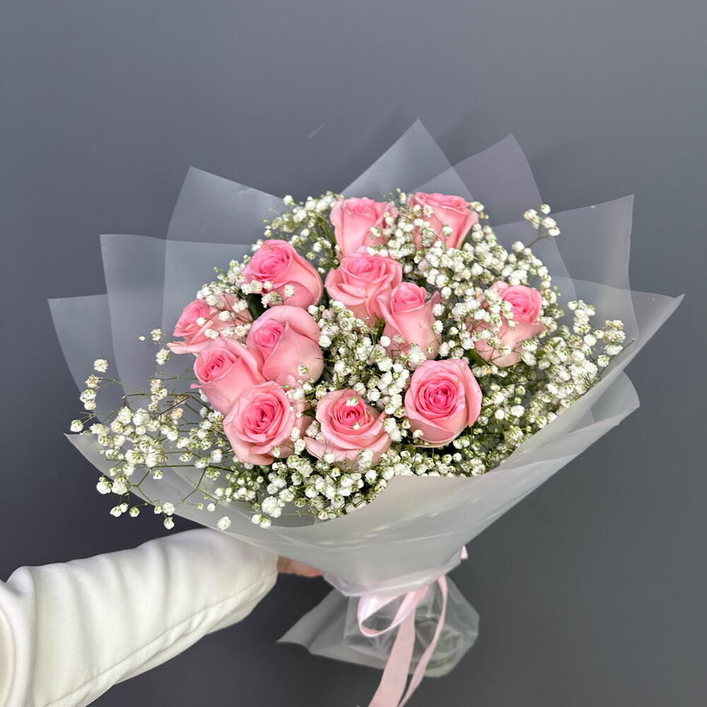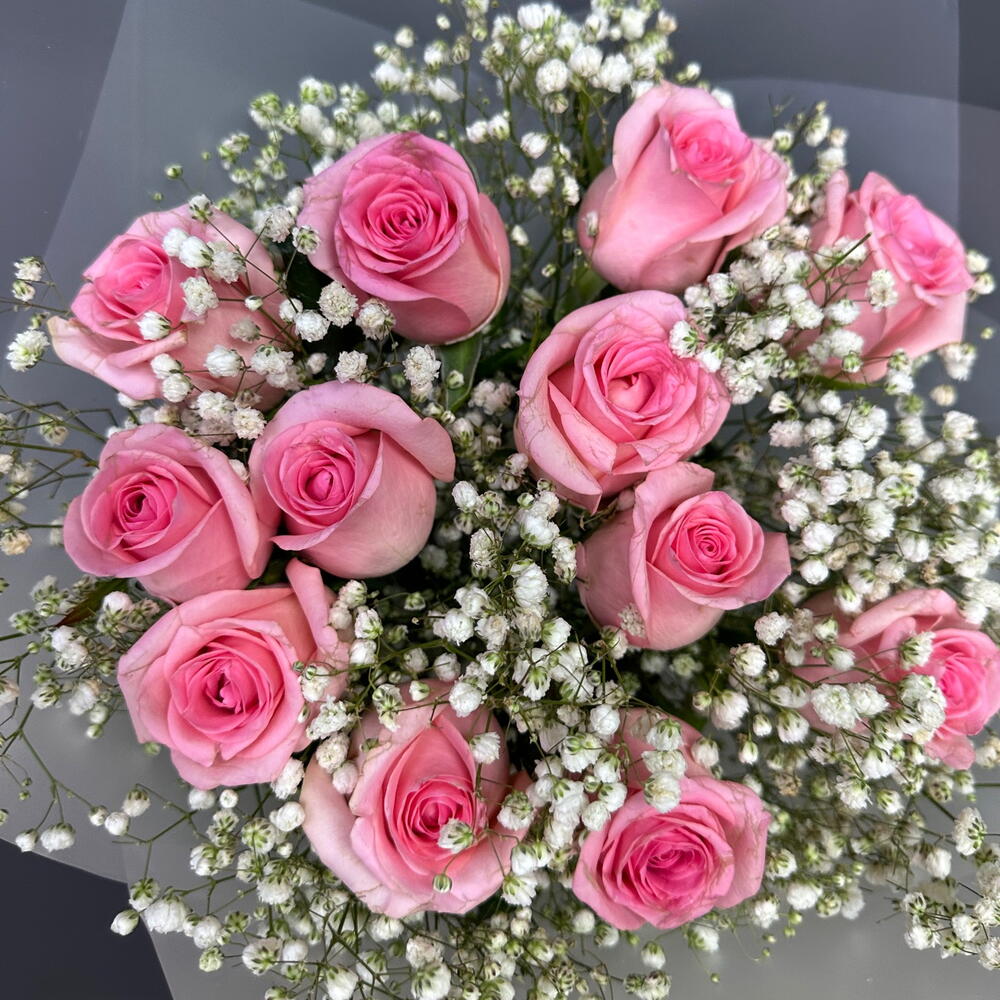 • Композиция из 4 гипсофил и 11 розовых роз – это идеальное сочетание нежности и красоты. Розовые розы символизируют любовь и романтику, а гипсофила добавляет легкости и воздушности.