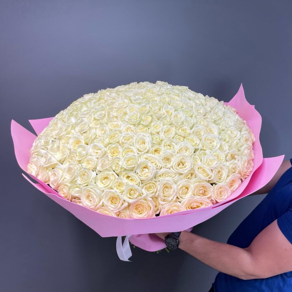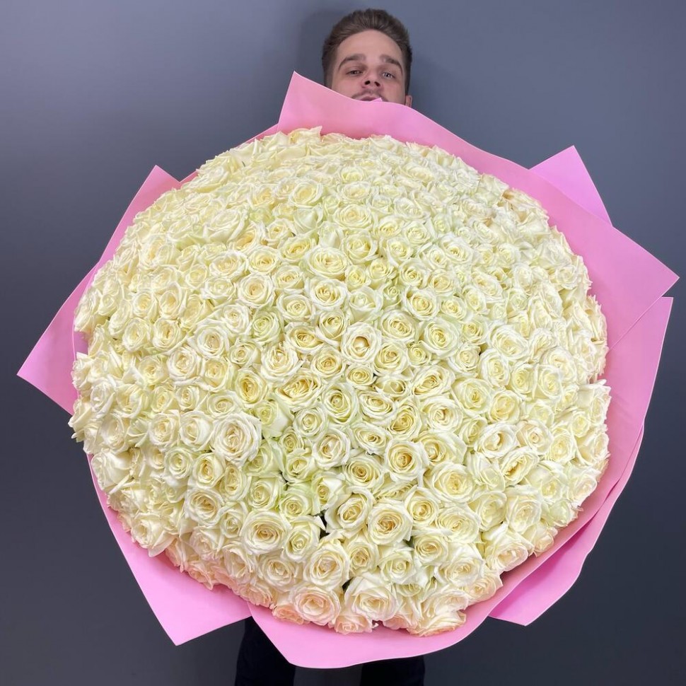 - Букет из 301 белой розы в розовом фоамиране — это настоящее произведение искусства, которое поразит всех своей изысканностью и красотой.
