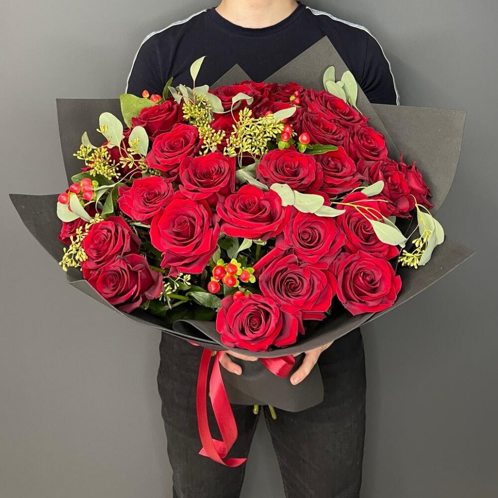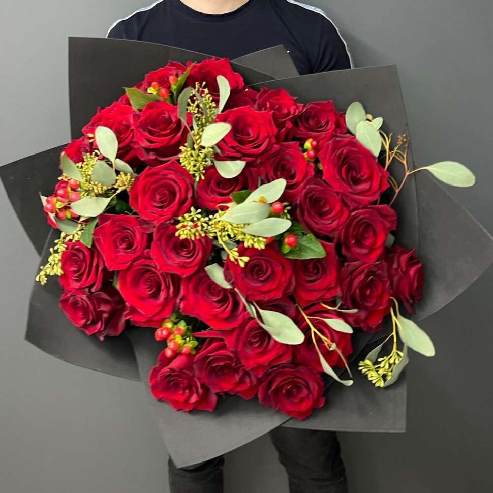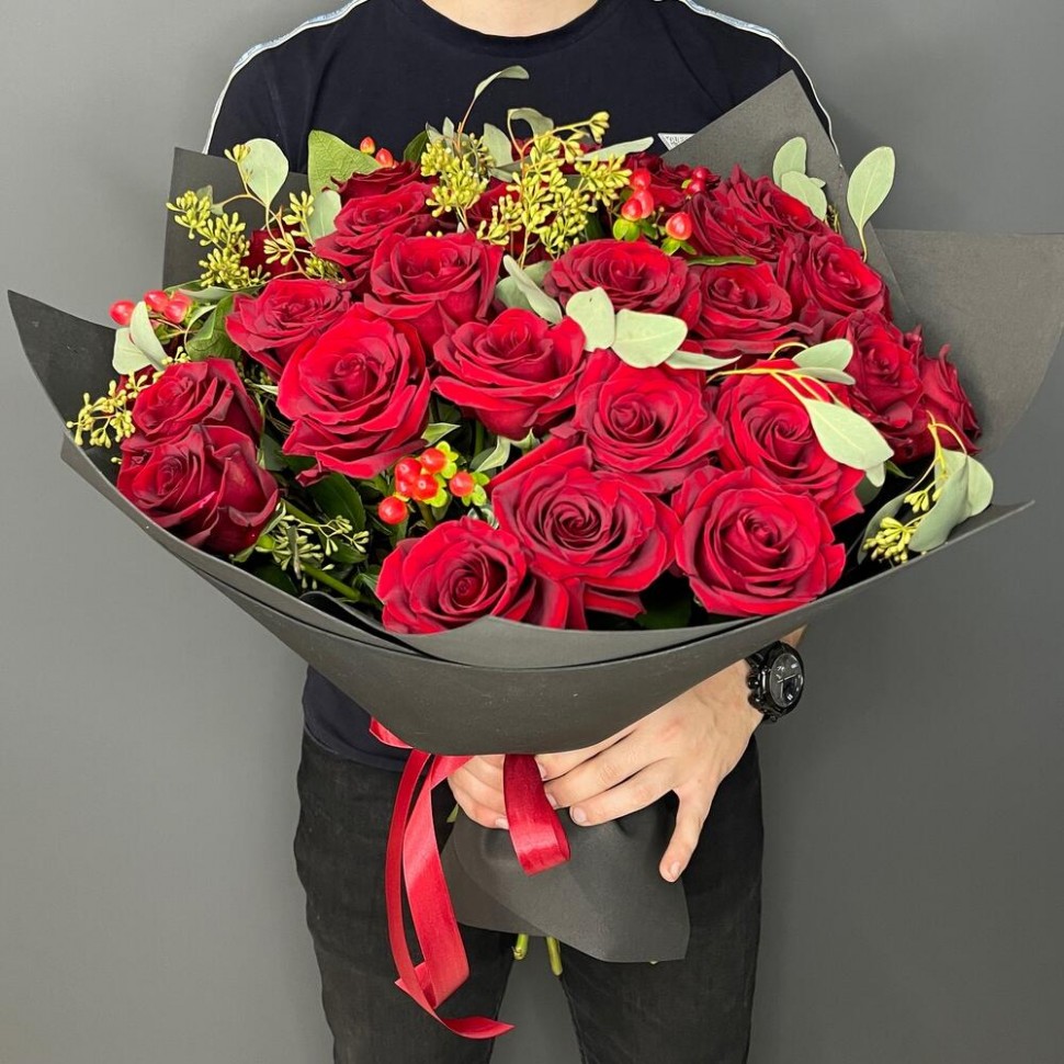- Этот букет из красных роз, красного гиперикума и эвкалипта — это настоящее произведение искусства. Каждый цветок в этом букете — это проявление страсти и любви, которые способны оживить самые яркие эмоции.