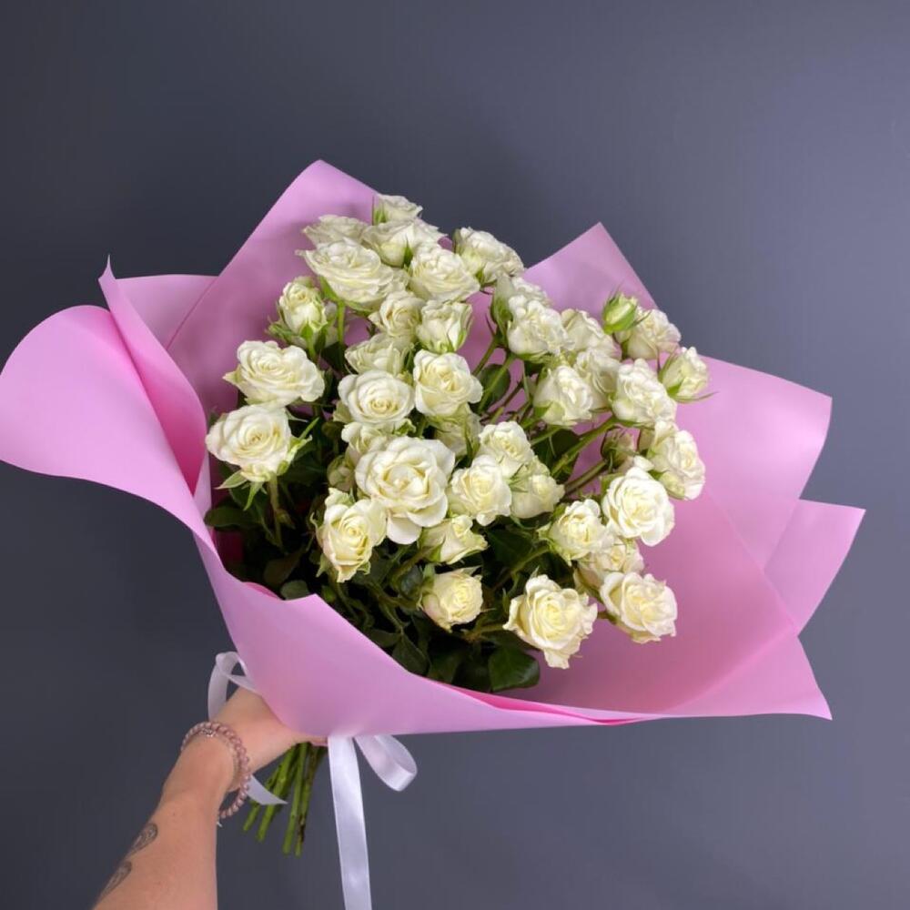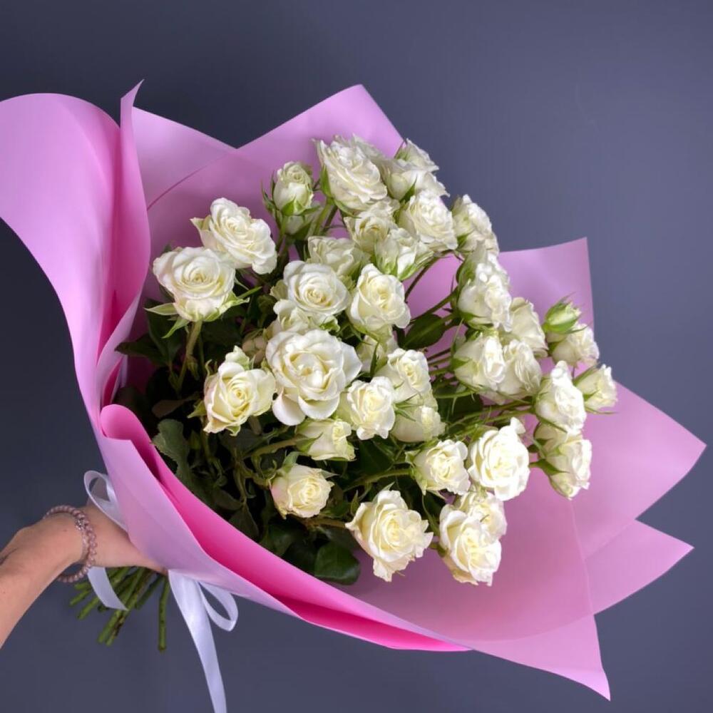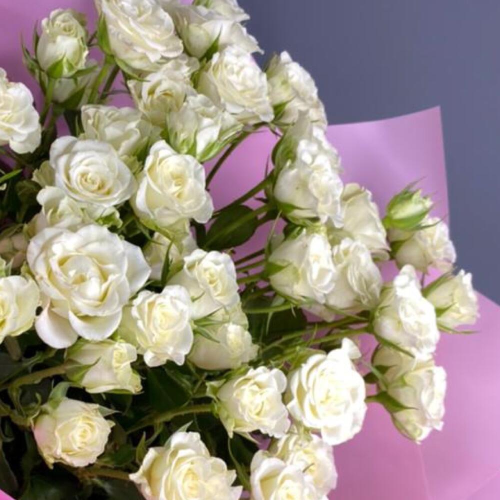 - Украсьте свой дом или подарите близким элегантную кустовую белую розу в розовой упаковке. Она порадует глаз своей изысканной красотой и нежностью.