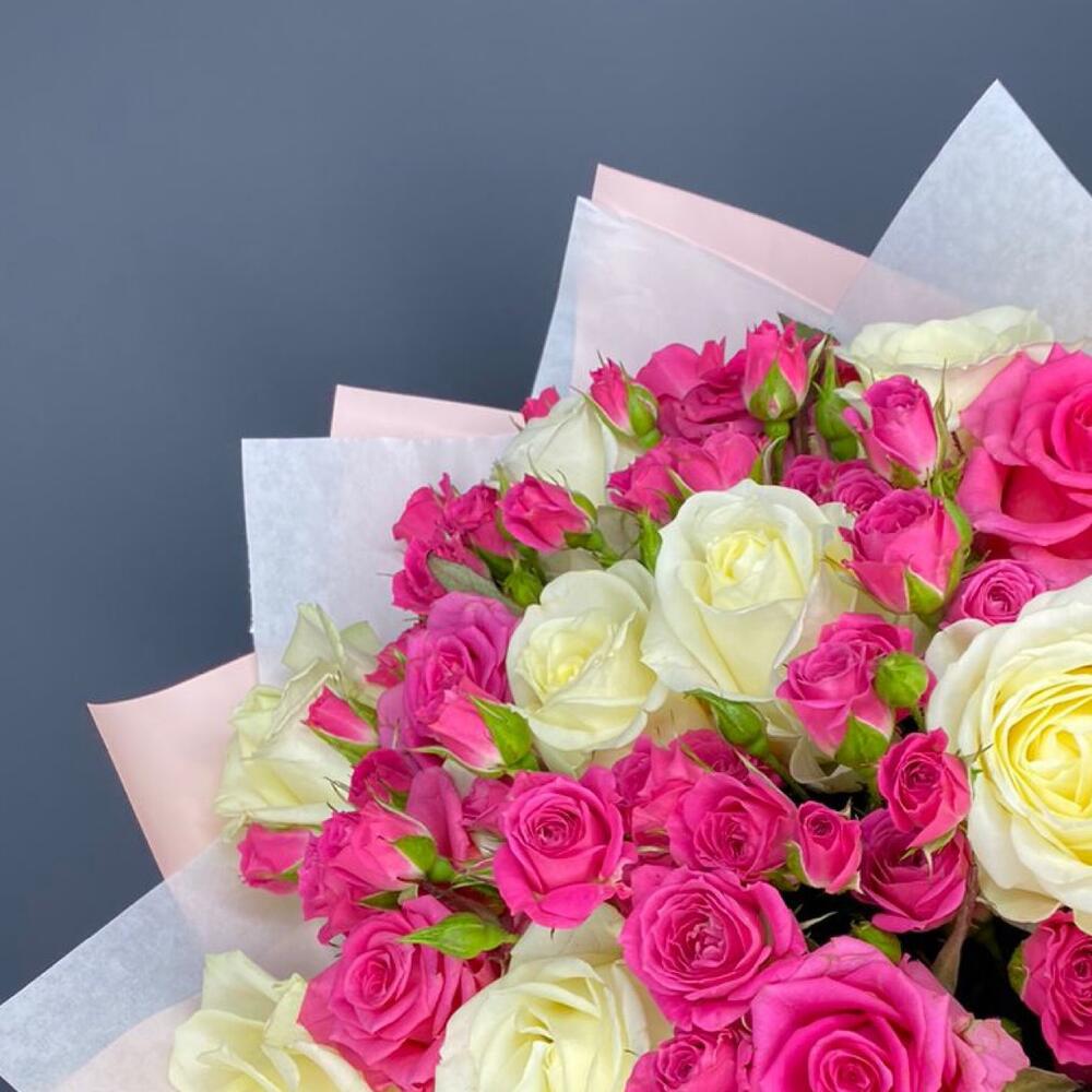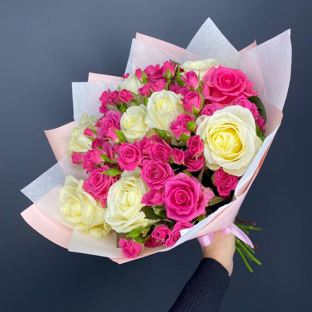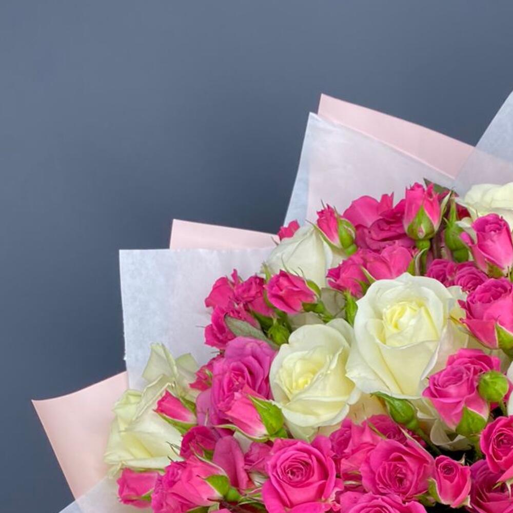 Кустовая роза — 11 шт Роза белая 50 см — 9 шт Дизайнерская упаковка — 2 шт