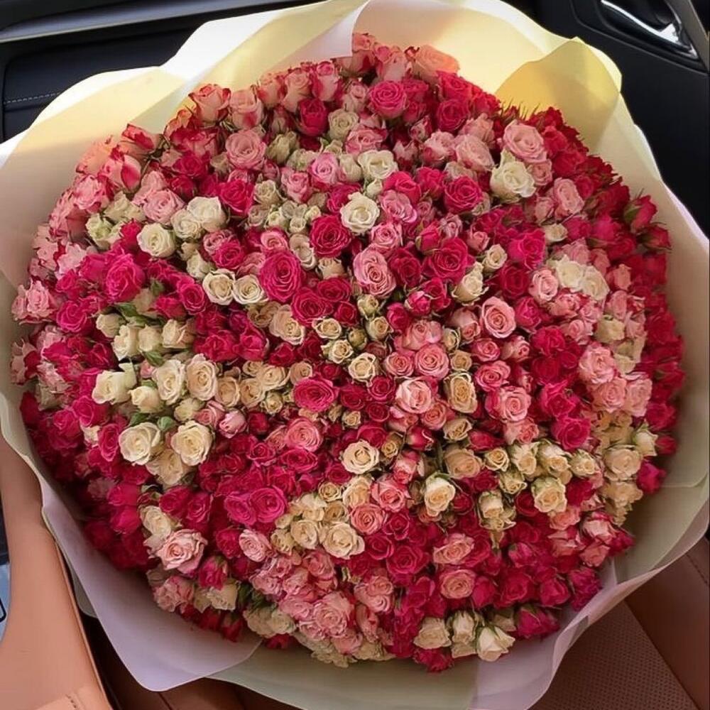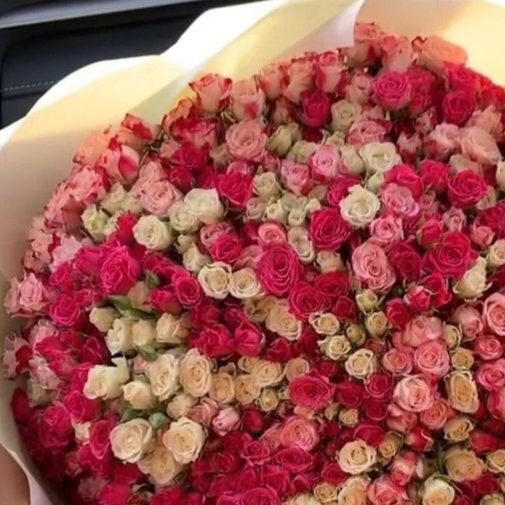 - Эксклюзивная композиция — 125 пышных бутонов в нежных розовых, ярких малиновых и чистых белых оттенках.