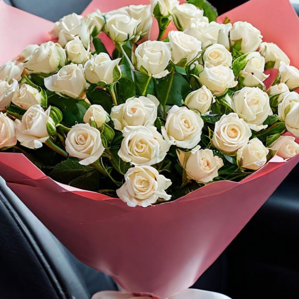 Букет составлен из свежих кустовых роз белого цвета с легким кремовым оттенком. Особенности композиции: