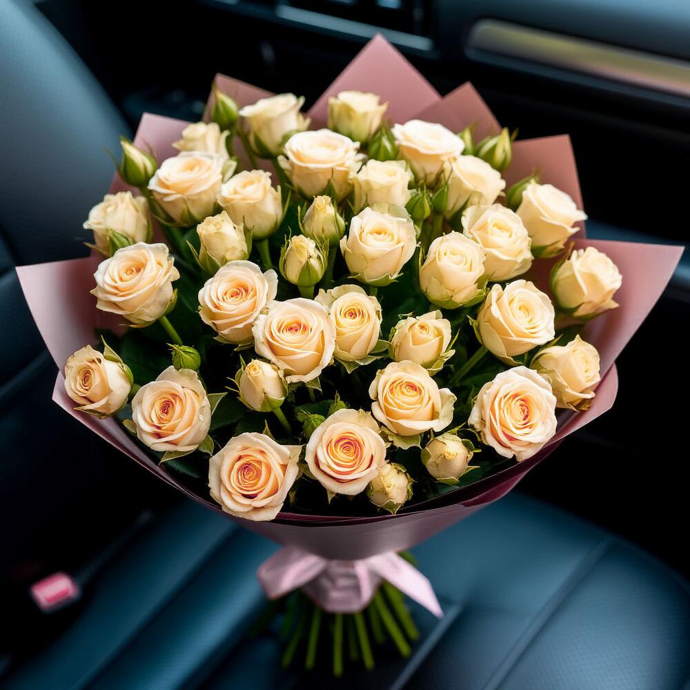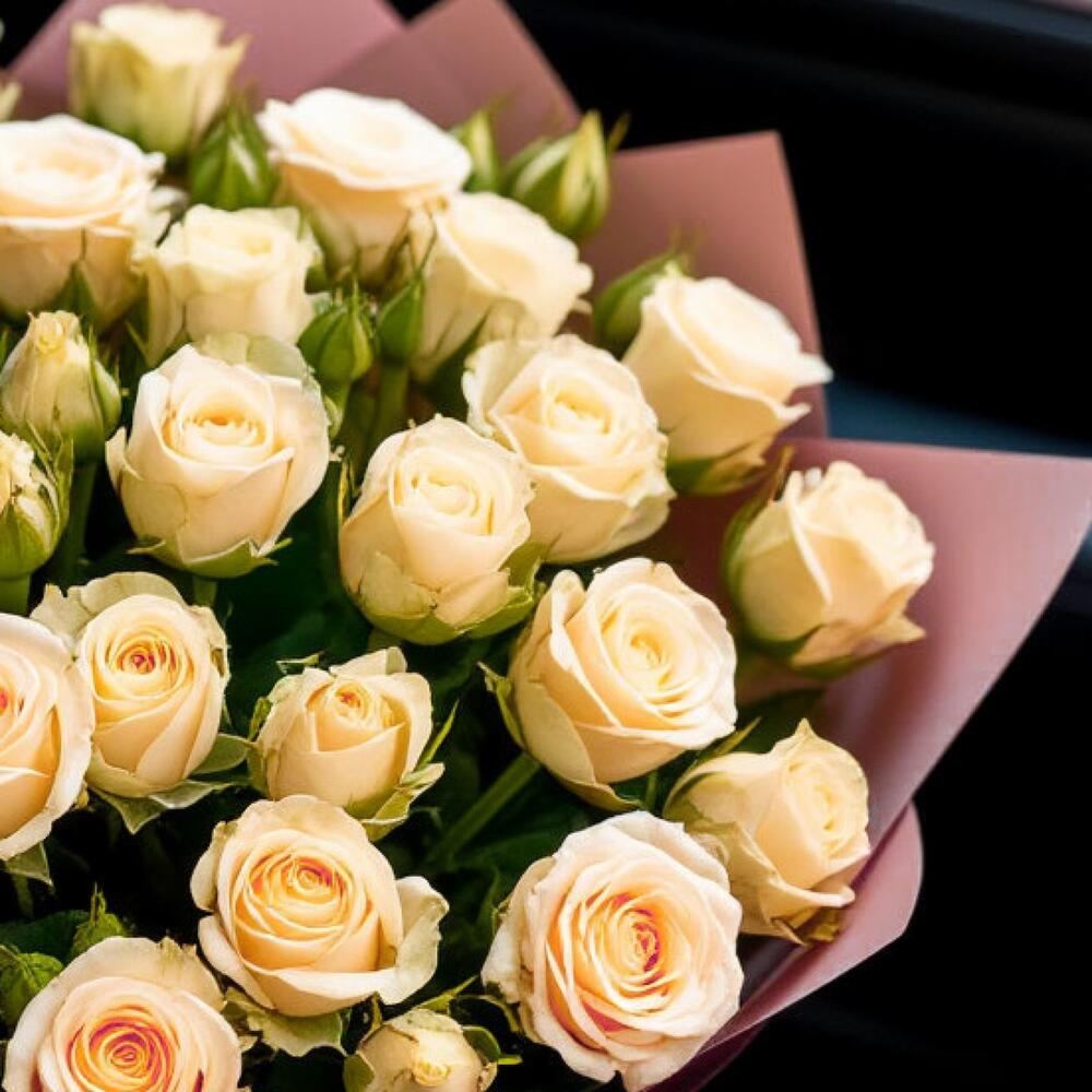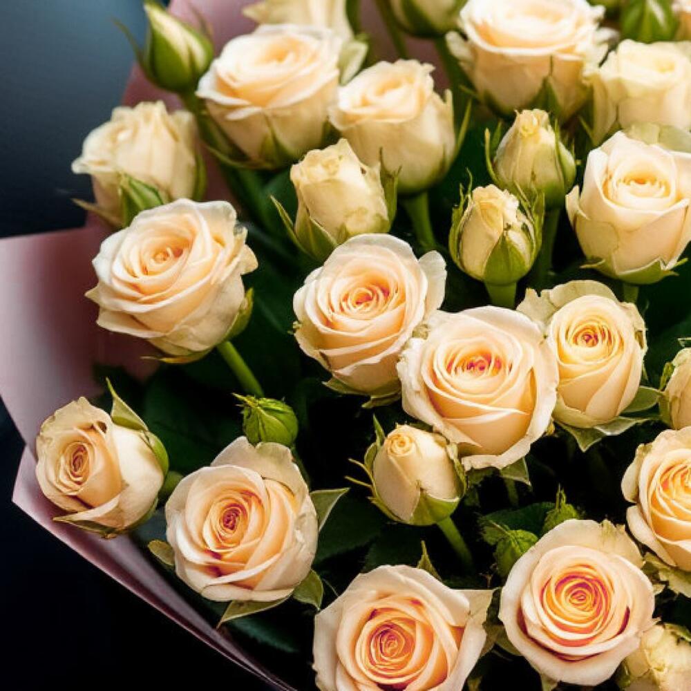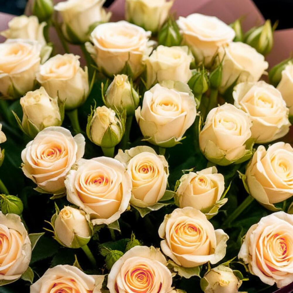Букет составлен из 15 кремовых кустовых роз премиум-сорта, отобранных по строгим стандартам качества. Каждая роза имеет: