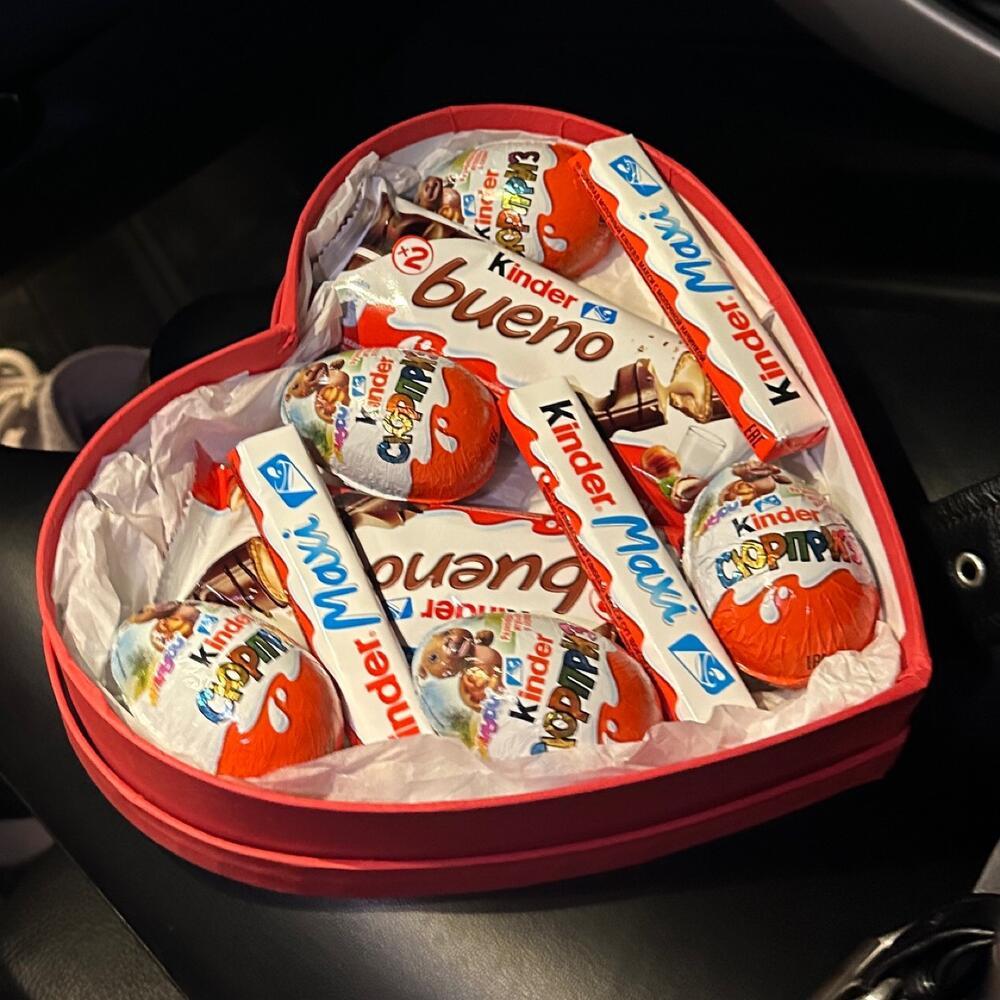 Коробка сердце — 5 шт Kinder bueno — 2 шт Kinder сюрприз — 5 шт Kinder шоколад — 3 шт