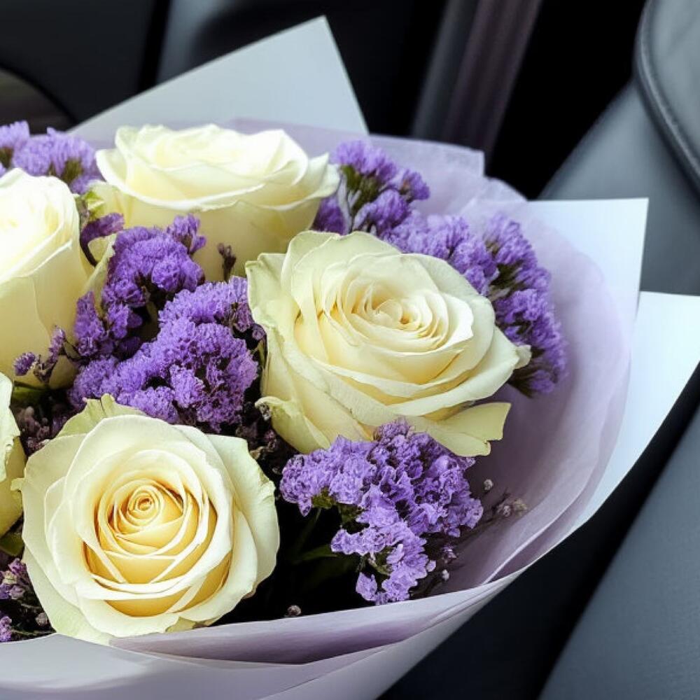 Букет оформлен в сиреневой дизайнерской упаковке: